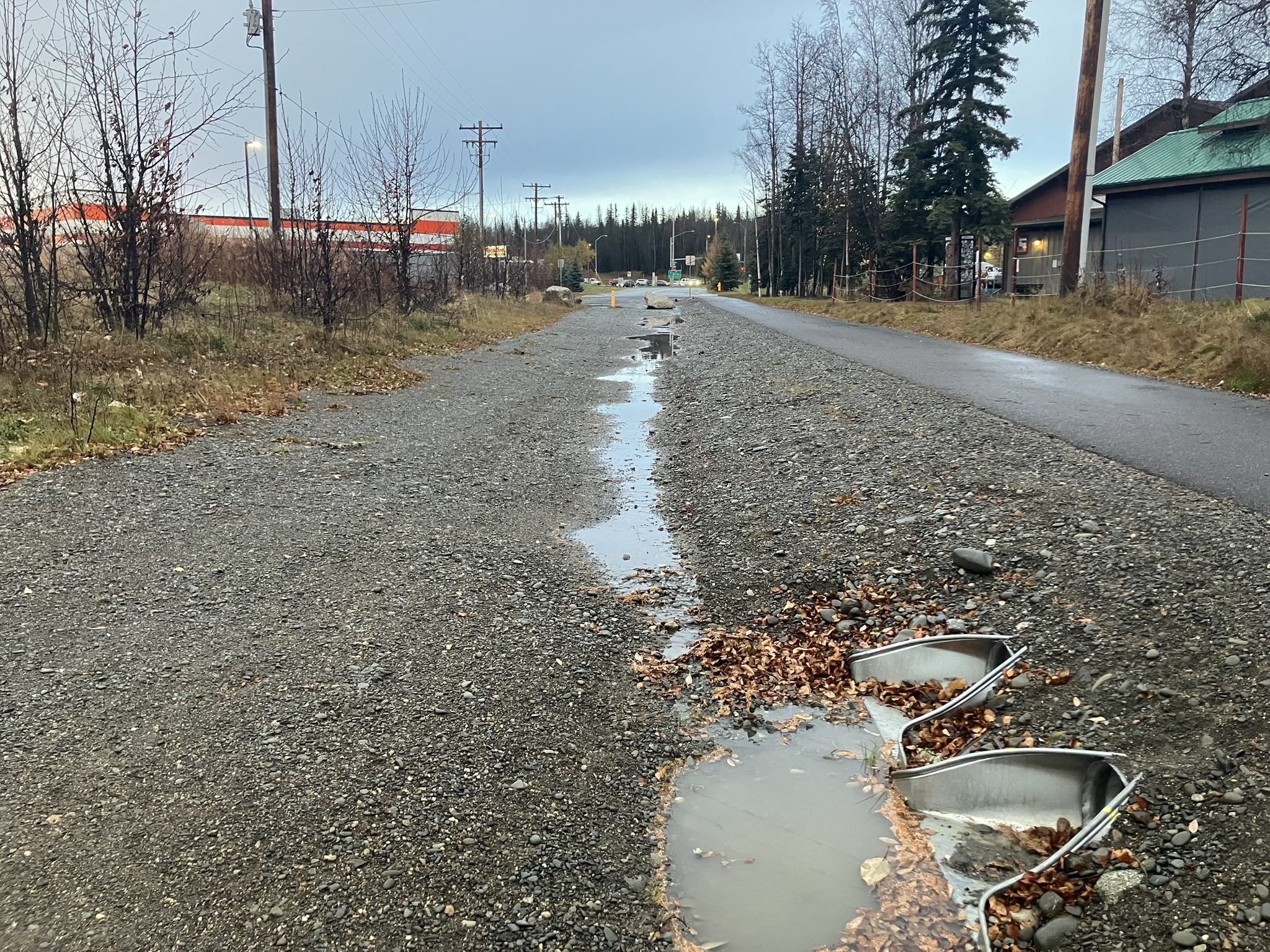 December 9, 2025Above: stormwater runoff from impervious surfaces flows towards two small culverts in Soldotna, Fall 2025